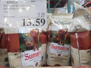 830529 WILLIAM SPARTIVENTO SUMATRA COFEE 1 kg 3 40 INSTANT SAVINGS EXPIRES ON 2017 04 23 13 59 by Costco East April 17, 2017, 1:29 pm 830529 WILLIAM SPARTIVENTO SUMATRA COFEE 1 kg ($3.40 INSTANT SAVINGS EXPIRES ON 2017-04-23) $13.59 See more Previous article Costco Canada East Secret Sale Items – Apr. 17, 2017 to Apr. 23 2017 – Ontario, Quebec & Atlantic Canada Written by Costco East