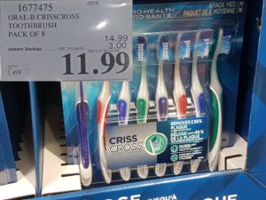 1677475 ORAL B CRISSCROSS TOOTHBRUSHES PACK OF 8 3 00 INSTANT SAVINGS EXPIRES ON 2017 04 16 11 99 by Costco East April 3, 2017, 6:07 pm 1677475 ORAL-B CRISSCROSS TOOTHBRUSHES PACK OF 8 ($3.00 INSTANT SAVINGS EXPIRES ON 2017-04-16) $11.99 See more Previous article Costco Canada East Secret Sale Items – Apr. 3, 2017 to Apr. 9, 2017 – Ontario, Quebec & Atlantic Canada Written by Costco East