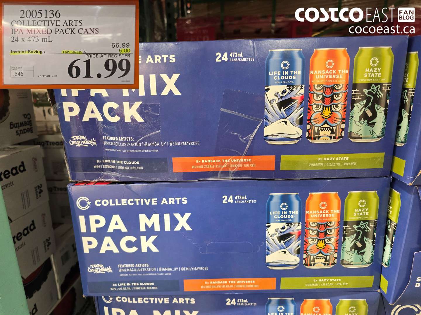 1917445 SIMPLY SPIKED VARIETY LEMONADE / LIMEADE $44.993427947 WHITE CLAW HARD SELTZER VARIETY 30 x 355 mL ($5.00 INSTANT SAVINGS EXPIRES ON 2026-02-22) $46.992002666 CANADIAN CLUB VARIETY PACK 24 x 355 mL ($4.00 INSTANT SAVINGS EXPIRES ON 2026-03-01) $32.99361811 COORS LIGHT CANS 60 x 355 mL ($5.00 INSTANT SAVINGS EXPIRES ON 2026-02-15) $74.99956783 BUD LIGHT CANS ($5.00 INSTANT SAVINGS EXPIRES ON 2026-02-22) $61.991896082 MOET & CHANDON CHAMPAGNE 750 mL $67.99107731 STONELEIGH SAUVIGNON BLANC 750 ml $16.991887933 BUSCH LIGHT CANS 48 x 355 mL $63.991993855 MACKINNON CROSSCUT CANADIAN ALE, CANS 24 x 473 mL $59.992021985 BEAUS BARN BURNER AMBER ALE 24×473 ml $45.99