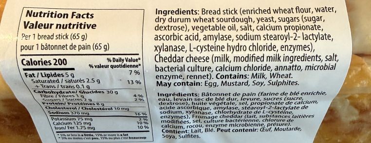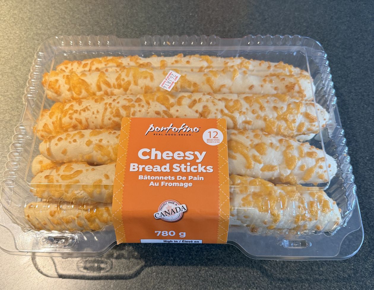 This week I picked up the Portofino Cheesy Bread Sticks to try and review. They looked pretty good and I wanted something to serve with lasagna and also use for packed lunches. I paid $9.99 Canadian for the 780 gram container.