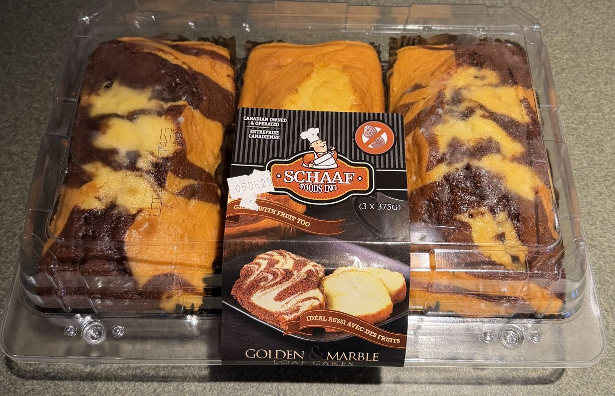 Today I’m reviewing these Schaaf Foods Golden and Marble Loaf Cakes from Costco. I’ve heard good things about these so I wanted to try them. There are three large loafs in the container, two marble and one golden and the cost is $10.99 Canadian.
