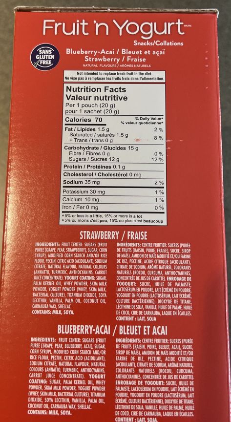 One package contains 70 calories, one and a half grams of fat, 15 grams of carbohydrates, zero grams of fibre, 12 grams of sugar and 35 milligrams of sodium. The ingredients list has milk listed in the yogurt coating ingredients if you’re following a dairy-free diet but they’re gluten-free and do have real fruit puree in them.
